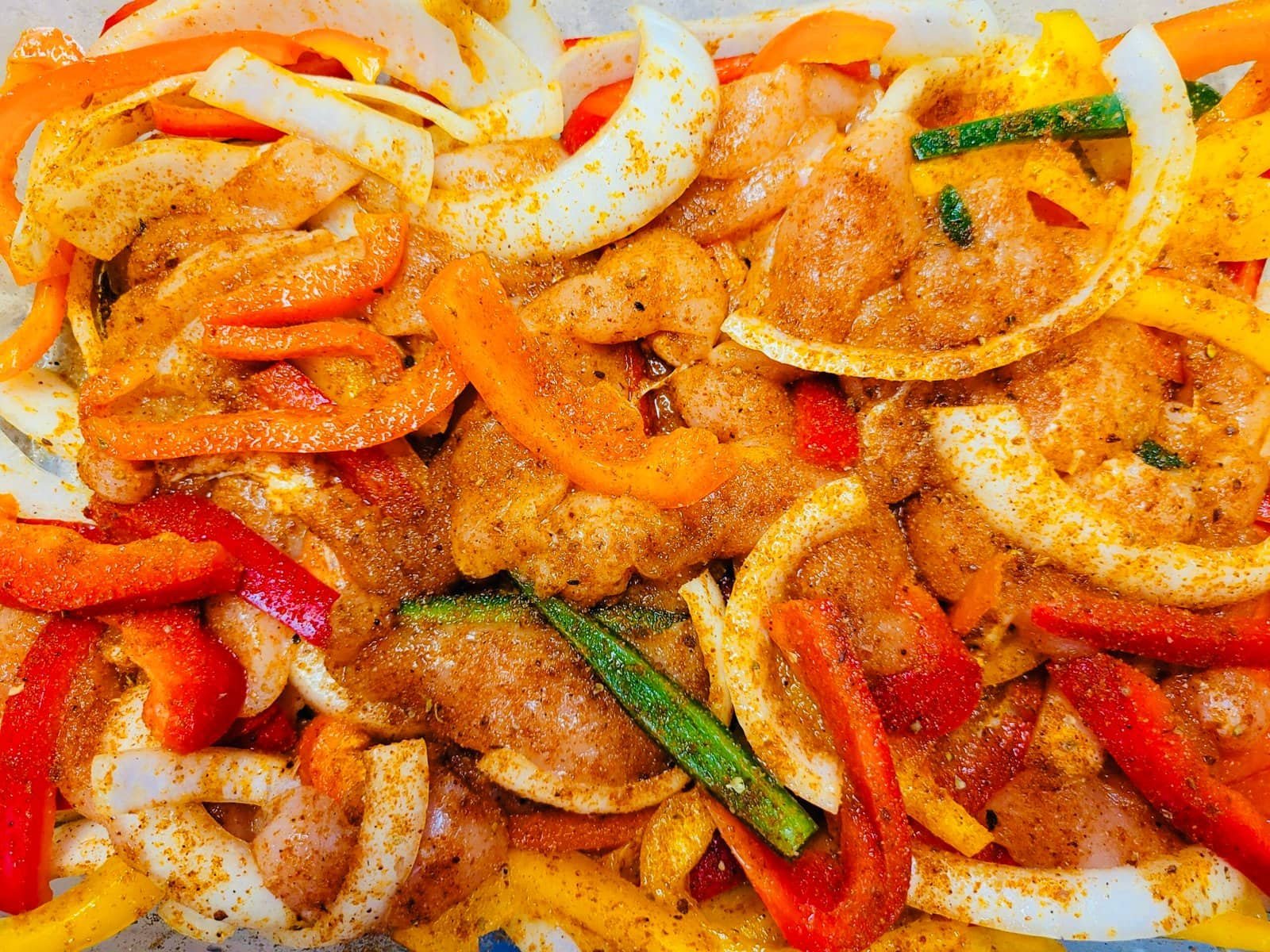 - Toss together all of the sliced vegetables, olive oil and taco seasoning.