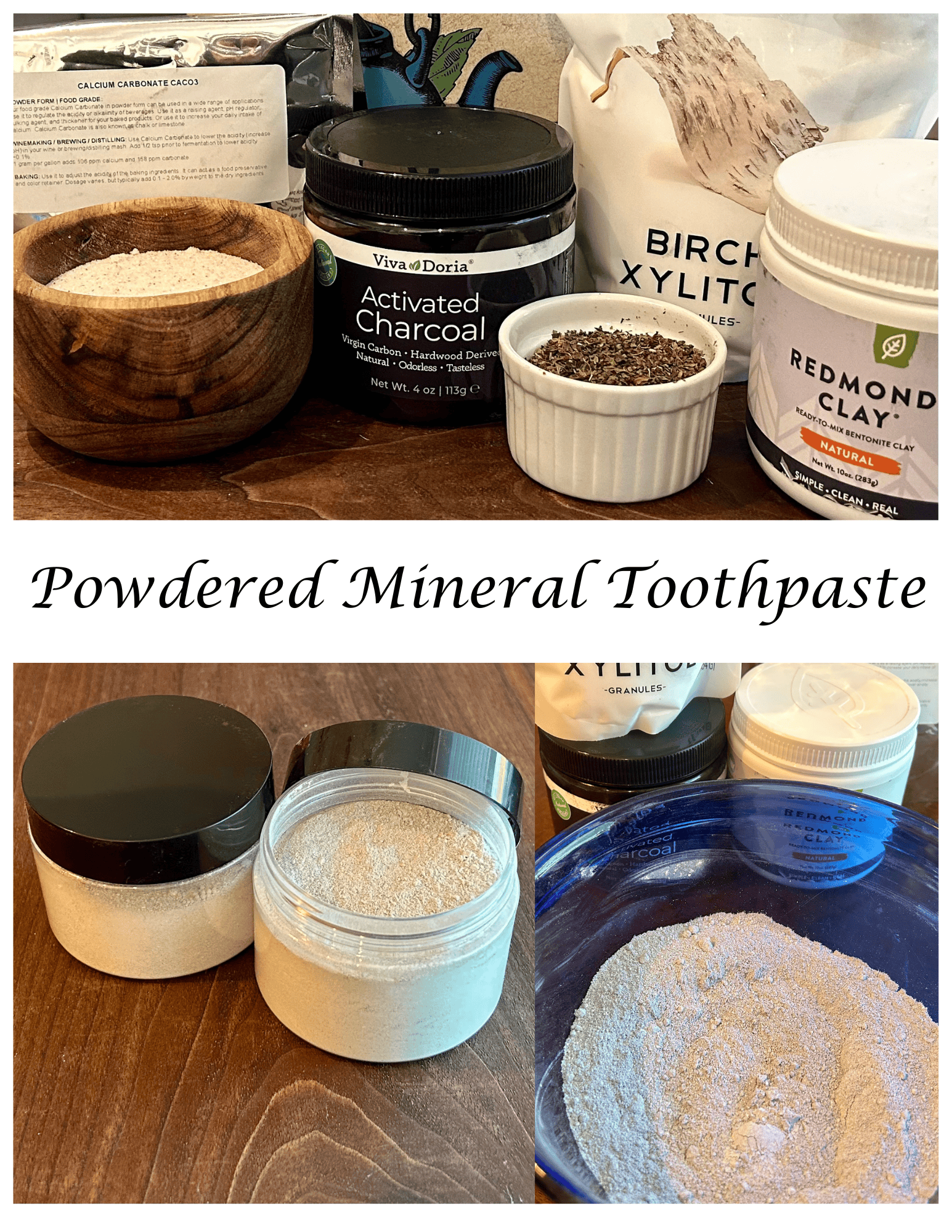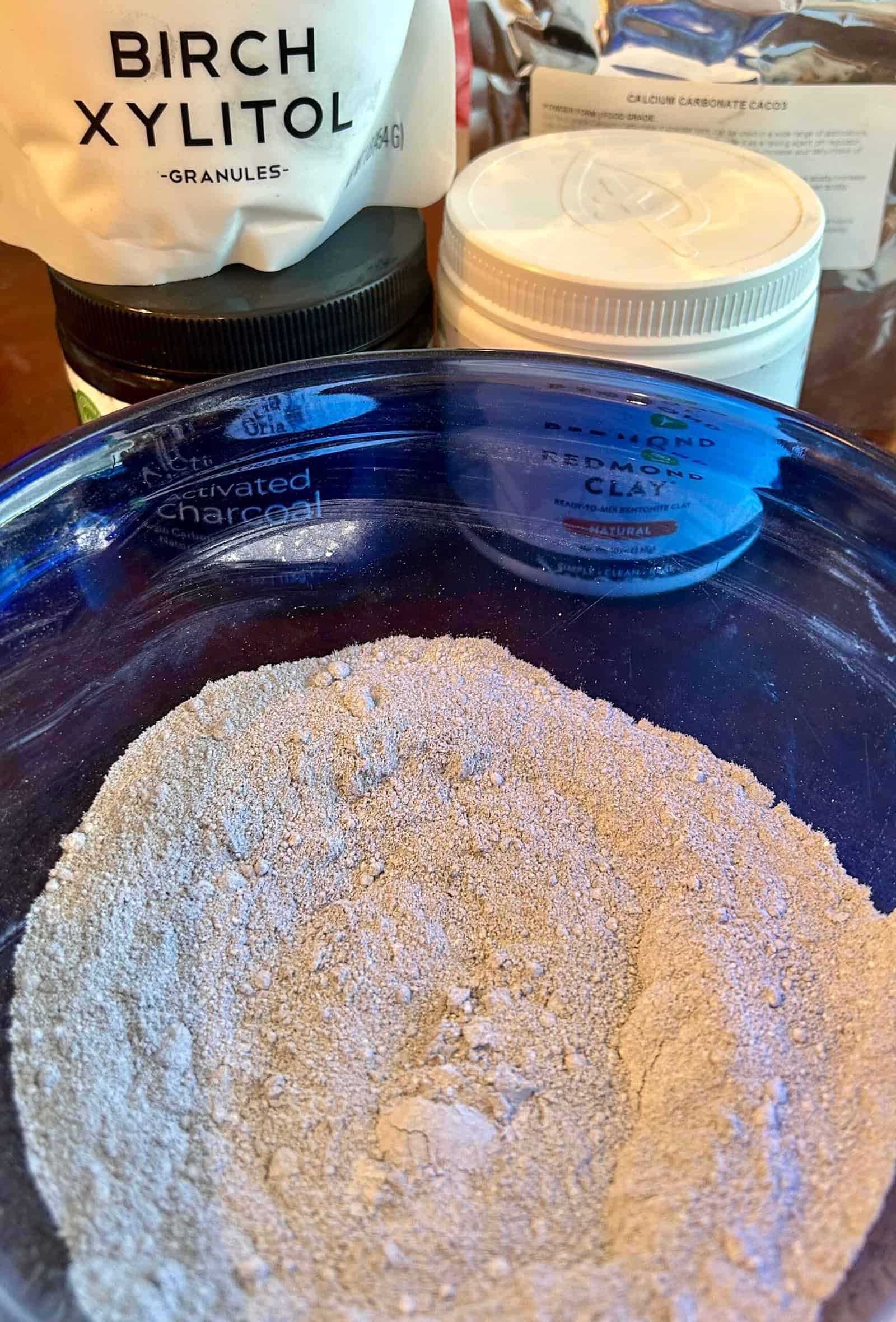 - Mix Dry Ingredients: In a non-metallic bowl (bentonite clay should not interact with metal), combine the bentonite clay, calcium carbonate, birch xylitol, mint, salt, and any optional dry ingredients like activated charcoal or ground spices.